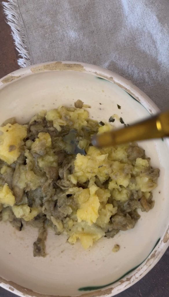 Remove the eggplant pulp, put it in a bowl, add the boiled potato, salt, and oil.