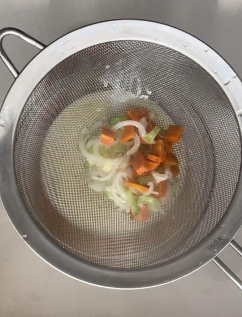 In another pan, sauté with oil, carrot, celery, and onion cut into pieces.