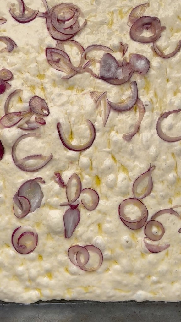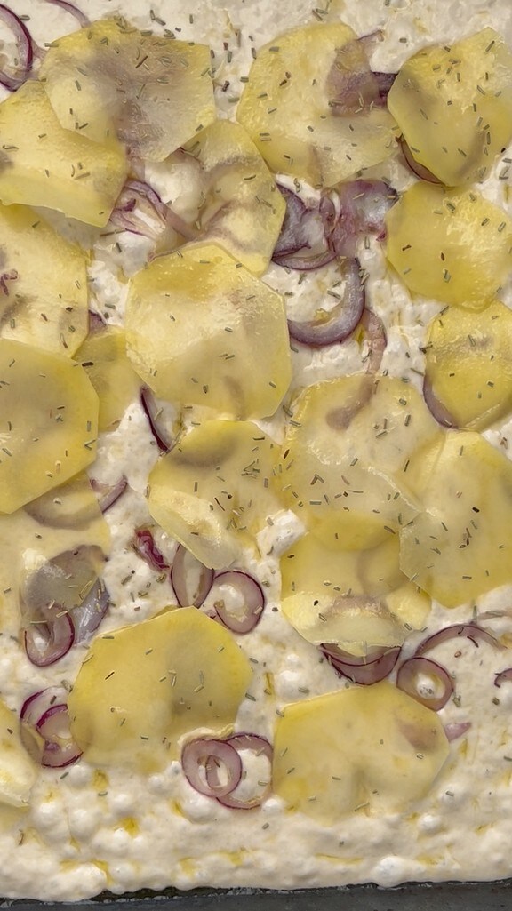 Today I am sharing with you a truly amazing dough High Hydration Pizza 24-Hour Fermentation. Those who follow me know that I have a passionate love for leavened products and every type of dough, especially high hydration ones like this case. Today I wanted to try a dough that might seem mushy and unworkable at the final result, but when you bake it, I assure you it gives a lot of satisfaction. I recommend you try it too. Naturally, being a very hydrated dough, it also has a long fermentation. So start kneading in the afternoon of the day before to put it in the oven the evening of the next day. Another good and positive thing about this dough is the fact that all the work is done in a bowl, so you only dirty that. Some folds with subsequent rests and bowl movements guarantee a truly optimal result, that is, a super crispy pizza on the outside and very soft inside. I wanted to top it with onion and potatoes, but you can also top it with simple tomato and mozzarella. If instead, you don’t feel like waiting 24 hours to make the tray pizza, try the No-knead Pizza crispy outside and soft inside.
