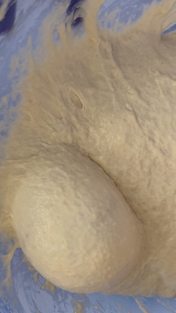 Vigorously slap the dough for about 10 minutes, with movements from bottom to top, until bubbles form. That’s the sign that the dough is ready to be put to rest