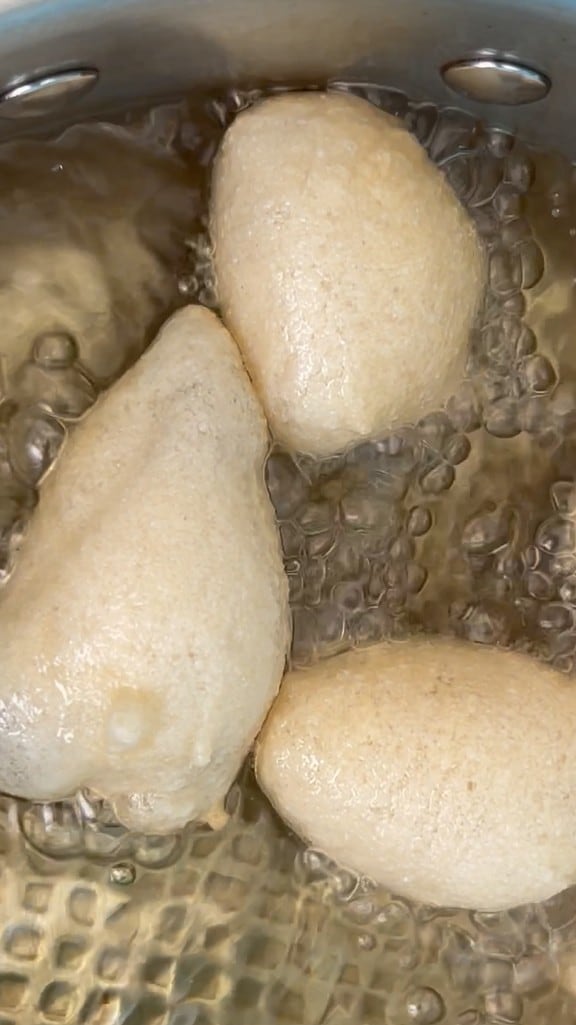 Slightly wet the spoon with water, drain it well, and take a bit of dough. Let it slide into the boiling peanut oil