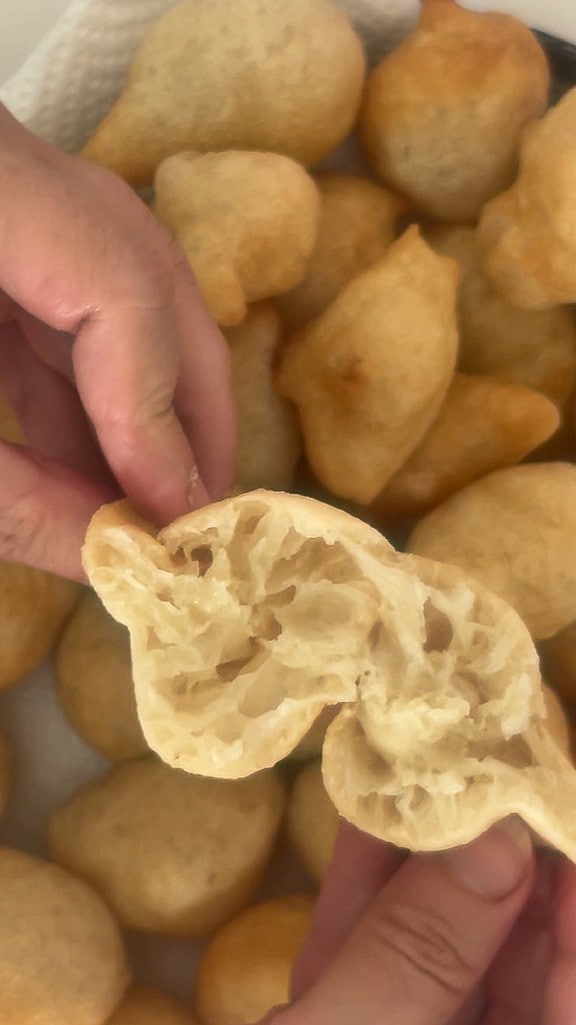 Being very light, the pettole do not flip easily, so use a ladle to pour oil over them to cook evenly