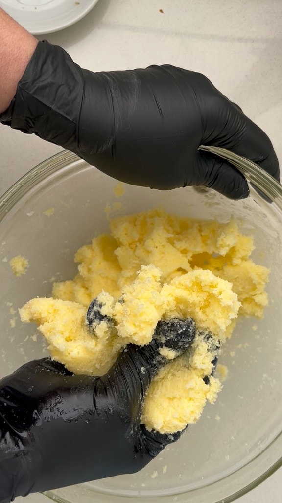 • Remove the shortcrust from the fridge, break it into pieces, and knead it again