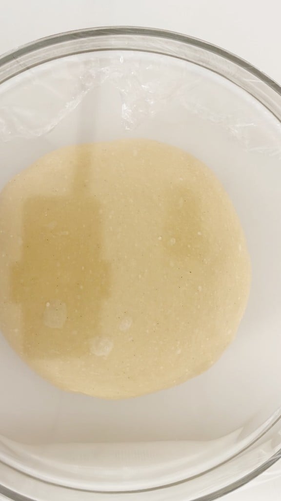 • until you get a smooth dough ball that we will let rest covered with plastic wrap for 1 hour. If the room temperature is high, even 30 minutes.