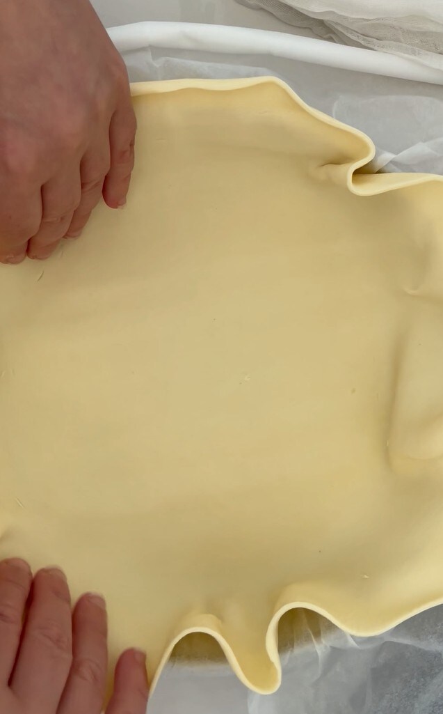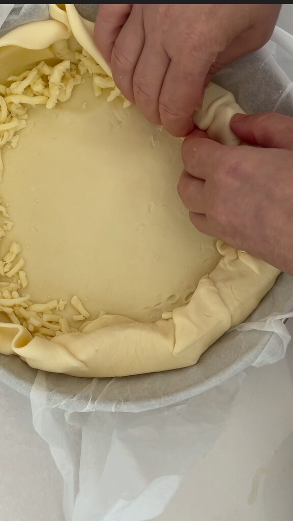 Line the 9-inch baking pan with the round puff pastry