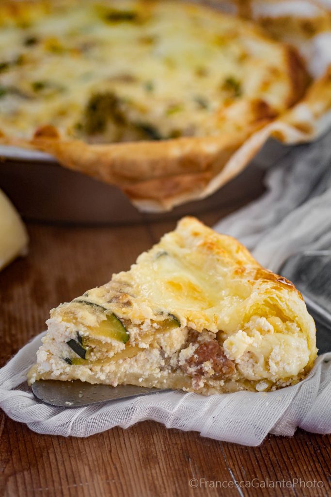 Today I share with you a truly indulgent recipe, the Quick Savory Pie with Melty Crust. Rustic pies are already super delicious, but trust me, this one with a melty cheese-filled crust is even more so. Puff pastry always solves a lot of our problems, especially when we are in a hurry to prepare an impromptu dinner. Usually, we buy it ready like in this case, but if you want to have fun making one very quickly, try this Quick Homemade Puff Pastry, I assure you it takes very little time, you store it in the freezer and defrost it when you need it. I filled this pie with delicious ricotta, some Philadelphia, fresh sausage, and zucchini. But if you like, you can replace the fresh sausage with minced meat or diced ham. I advise against adding mozzarella to the filling because it would release too much water, compromising the quality of the rustic pie.