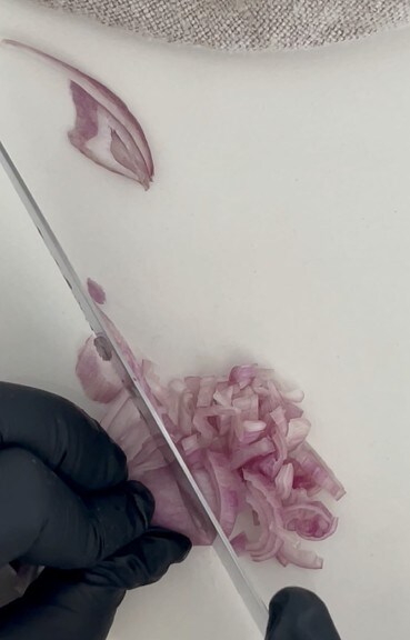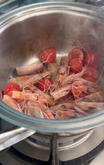 Cut the shrimp into pieces and season with salt, extra virgin olive oil, and pepper