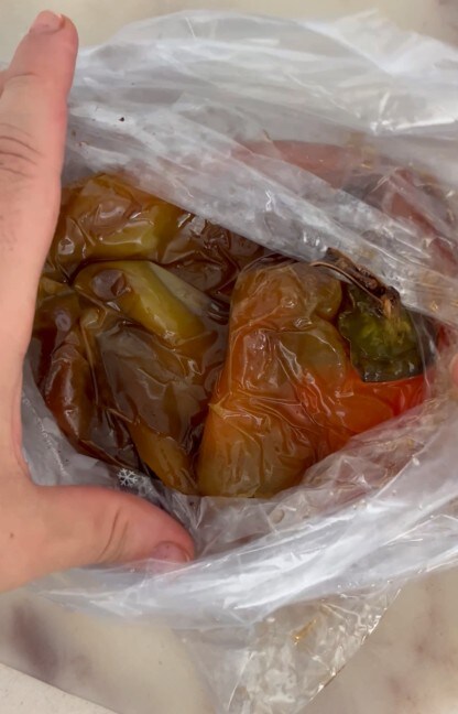 Wash, dry, and bake the peppers at 400°F for about 35 minutes. Remove the peppers from the oven and place them in a food bag. Let them cool down
