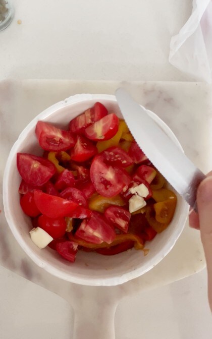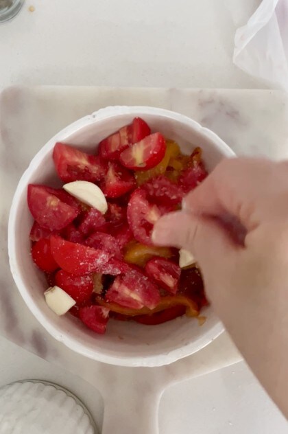 A highly appreciated side dish? Try these ROASTED PEPPERS SEASONED TARANTINA STYLE. Enjoyed on a nice frisella of durum wheat or on a delicious slice of toasted wheat bread, perhaps from Altamura or Matera or Laterza, and you will see that you will no longer be able to do without this wonderful side dish, which is ideal to accompany both meat and fish dishes. The tip for quickly peeling the peppers is to roast them either in the oven or on a grill, (I have always found it effective to cook them in the oven) and immediately place them in a food bag. Close it and wait for it to cool a bit and you will see that the skin will come off in a fraction of a second. I added tomatoes to the recipe because I particularly love them and I believe they create a perfect combination with peppers, but if you want, you can omit them