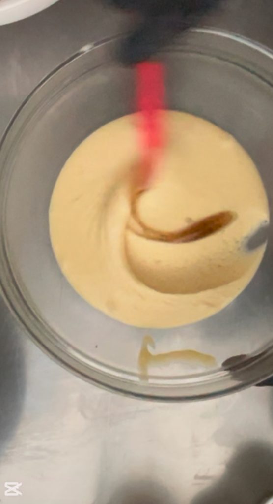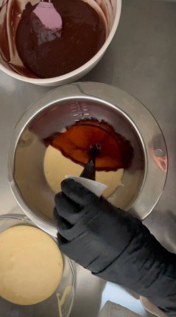 • After mixing everything, divide the mascarpone into three equal parts. Then put 85 g in one bowl,
