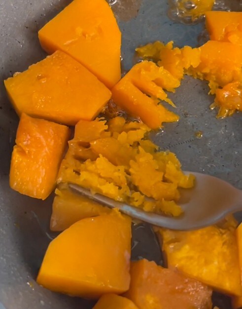 • Mash the pumpkin into a puree with a fork.