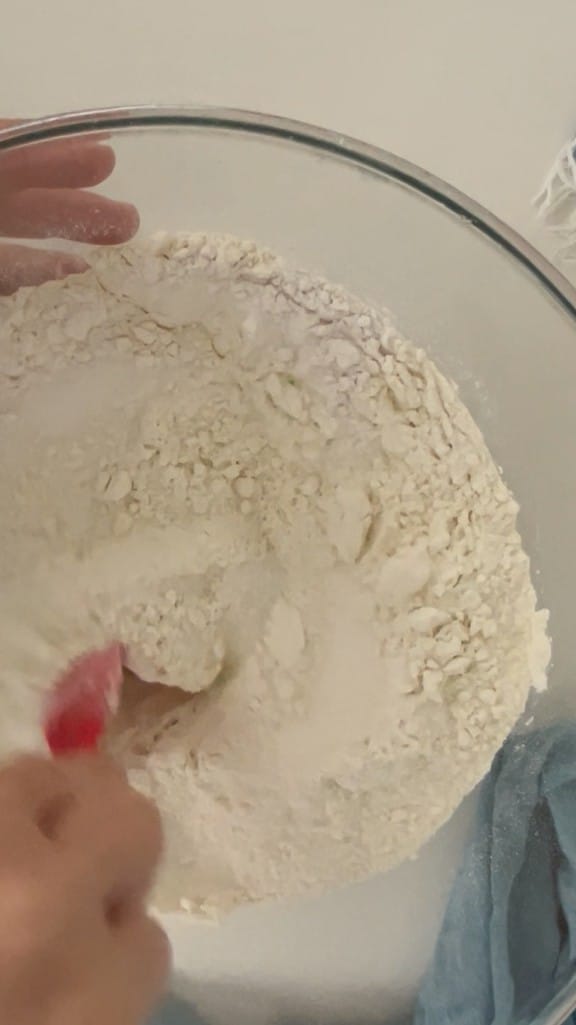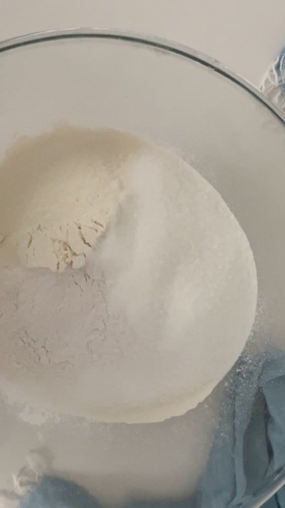 In a bowl, add sifted flour, sugar, baking powder, and a pinch of salt.