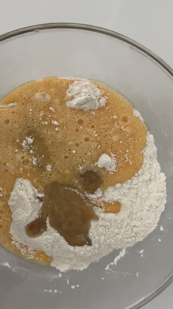 At this point, add the liquids and banana puree to the dry ingredients.