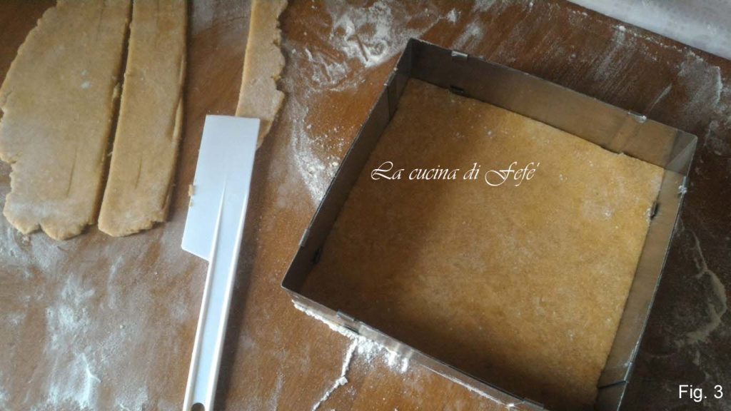 After the rest and cooling times of the cream, take the shortcrust pastry, divide it into two parts, one slightly larger than the other, roll out the first dough into a thin sheet. I used an adjustable square ring, but you can butter and flour a 20/22 cm diameter pan and lay the shortcrust pastry in it (fig. 3).