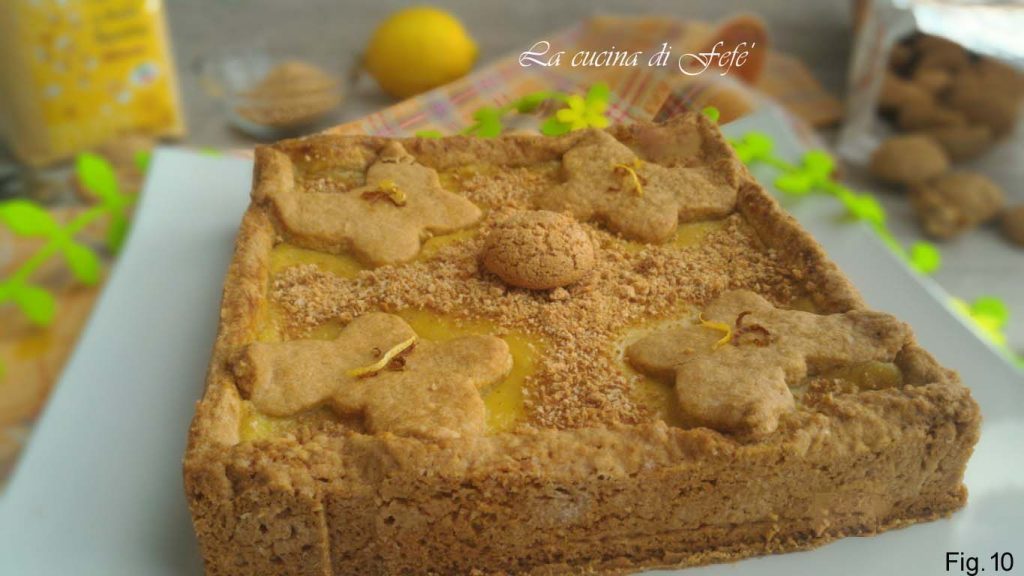 As promised, here is finally the complete recipe for the amaretto cake, made with a shortcrust pastry base of these little cookies that I am very fond of, and a delicate lemon filling. To lighten the complexity of the dessert, in fact, I preferred a cream less classic, vegan style, therefore without eggs and milk. And although, I confess, I had some reservations about it, the result was far above my expectations! An elegant and fragrant cake, perfect for all those occasions like birthdays, name days, or simply for a special treat! A true explosion of flavors! A crunchy shell that encloses a cream made with plant-based milk, cornstarch, sugar, and a touch of turmeric that will give it a perfect color! In short, a simple and genuine dessert that will undoubtedly surprise you!