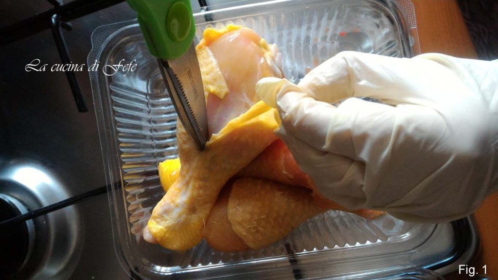 Start by cleaning the drumsticks. Dab them with some kitchen paper towels. Do not rinse them, as washing does not eliminate pathogenic bacteria and instead increases the risk of contamination. Remove their skin with the help of kitchen scissors (fig. 1).