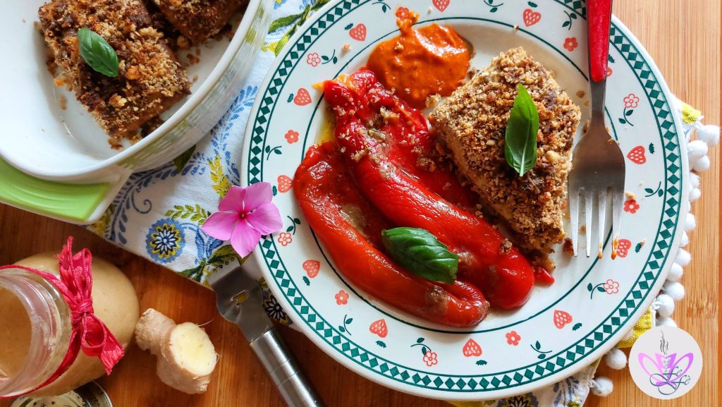 Lately, I’ve often talked about how important it is to incorporate this food into any diet, especially for women who are in menopause or approaching this delicate period! I’m talking about tofu, also known as vegetable cheese due to its production method, being a food derived from the curdling of soy milk with numerous health benefits, particularly for the cardiovascular system. Tofu is very rich in plant proteins, which is why it is frequently used in vegetarian or vegan diets as a substitute for animal-derived protein sources (meat, fish). From a micronutrient perspective, it is rich in iron and calcium and relatively low in calories. Paired with a generous serving of seasonal vegetables and a portion of preferably whole grains, tofu proves to be a super healthy dish! Since many, intrigued by the qualities of this food, have tried consuming it only to be disappointed by its “neutral taste,” tofu has unjustly gained a bad reputation over time because of those who simply put it on the plate as it is! Here is a way to make it decidedly more flavorful and appetizing. Marinate the tofu in a dressing based on soy sauce and my kitchen joker, my beloved sesame cream (tahini), then bread it and bake it. I paired it with peeled roasted peppers and a red pepper sauce that complemented it divinely! In just a few simple steps, you can serve a healthy main dish, rich in protein and with a surprising taste!