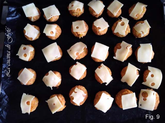 • Preheat the oven to 356°F (180°C) and bake for 12 minutes, then remove, flip them, and add a little Emmenthal cheese on top of each patty (fig. 9).