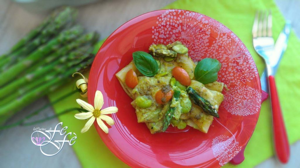 The paccheri are my current passion! After trying them in many ways, even stuffed like little cannelloni, today I want to offer you a lighter, very spring-like and fragrant recipe: paccheri with asparagus pesto, robiola and fava beans.