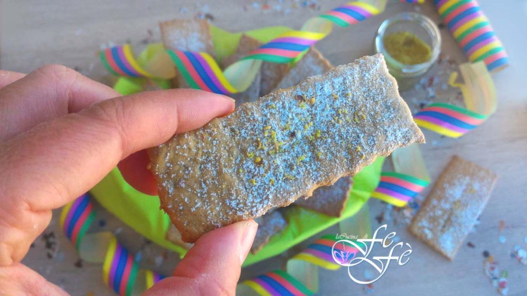 Today is Fat Thursday and I’m here to offer you a Carnival-style recipe! The famous chiacchiere, or frappe, as they are often called in other parts of Italy! These are strictly fried sweets, and far be it from me to say otherwise! Unfortunately for me, the doctor has recently put me on a diet and I have to abstain even on rare occasions like this from indulging! Of course, I had to celebrate somehow, don’t you think? And here is my baked version, much lighter and with very little butter, but equally delicious. Honestly, I remember making them in the past, but I didn’t like them at all, so I skipped suggesting them on the blog! This year, however, I decided to enrich them with flavors from my homeland by adding Bronte pistachio flour and Sicilian almonds to the dough. I must say they were truly a delight. I say ‘were’ because we practically devoured them all! So much for the diet! But who cares, they were light! I’m happy to share this recipe, as I believe I’m not the only one who can’t indulge in frying or doesn’t want to! And it’s certainly a good compromise considering the final result! In fact, I’m not going to claim they are as good as the fried ones, but I assure you their biscuit-like and crunchy texture is not bad at all, unexpectedly exceeding expectations! Then, on my niece’s suggestion, I embellished them with a dark chocolate glaze and more pistachio flour, which will give the palate that extra touch of indulgence that children especially desire! Try it to believe it!