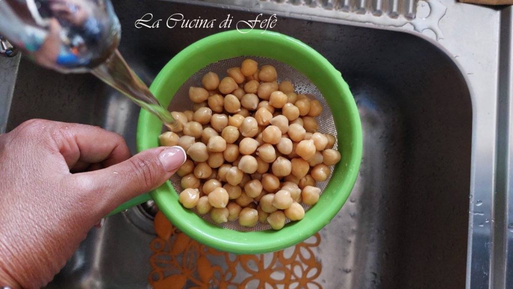 With the help of a strainer, rinse the chickpeas well under running water to reduce sodium content and remove any residues and impurities.