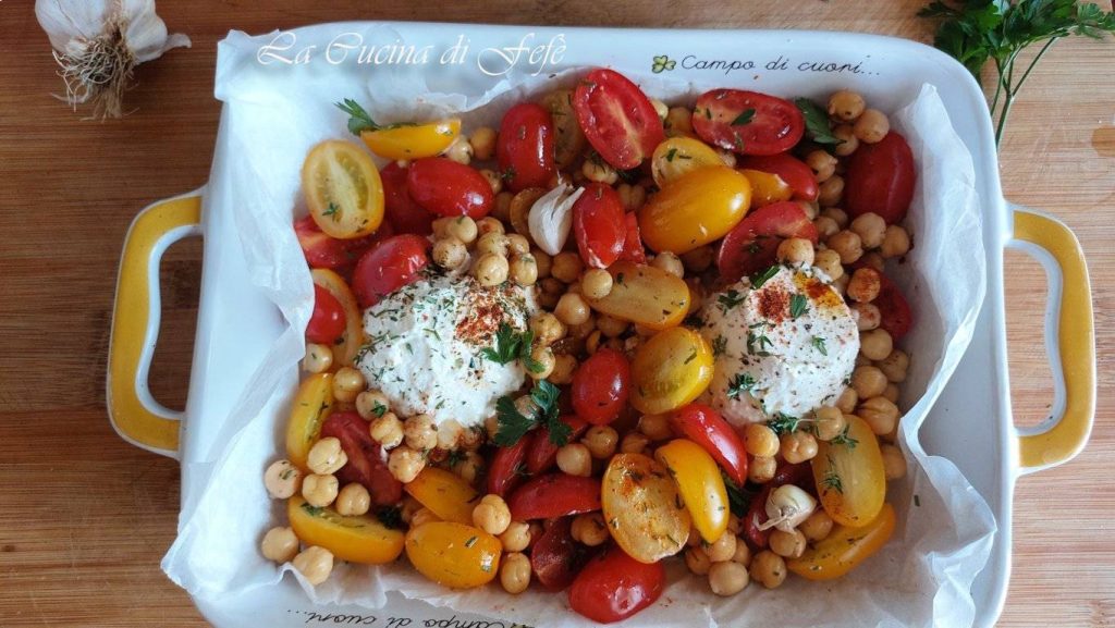 In a baking dish lined with parchment paper, place the two ricotta in the center, arrange the cherry tomatoes and chickpeas around them.