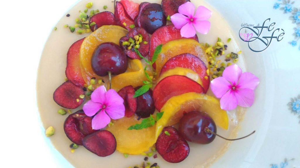 Lately on my blog, you will find a nice array of Sicilian recipes, especially desserts, because I think it’s nice to enhance your territory starting from the good table! The biancomangiare is an emblem, certainly not the only one, but surely among the main ones! It is one of those spoon desserts that in its simplicity and delicacy, has become a classic of traditional Sicilian cuisine. Dating back to at least the 12th century and soon spreading in Sicily and later in the rest of Mediterranean Europe, it owes its name to the fact that it’s made with all-white raw materials like cow’s milk and dessert starch. A color that has always represented purity and asceticism. It is prepared in just a few minutes, left to rest in the fridge for a few hours, after which you will have a truly delightful dessert, also because you can garnish it differently each time! Depending on the area, in fact, various ingredients are added. Among the many versions, for example, the Modica recipe deserves particular mention, which by replacing cow’s milk with almond milk, gave rise to the refreshing almond gelo. Today, however, I propose my fresh and healthy variant of biancomangiare, with seasonal fruit based on juicy cherries and red and white plums! Practically genius! You can indeed serve dessert and fruit together on a single plate at the end of the meal! I won’t tell you what a great impression you’ll make!
