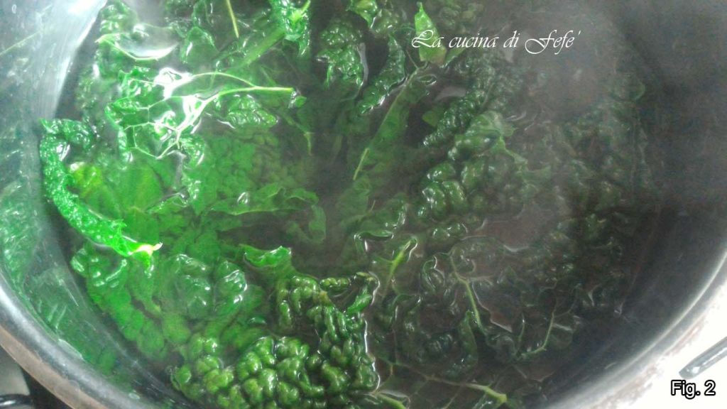 Wash and clean the black cabbage leaves, cutting them into strips and removing the tougher central rib (fig. 1).