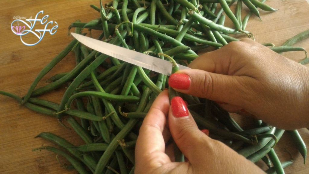 Meanwhile, trim the green beans by cutting off the ends with a sharp knife or simply with your hands.