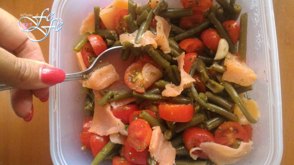 Add the tomatoes to the green beans and season with garlic cloves, a generous drizzle of olive oil, apple cider vinegar, a pinch of salt, and oregano. Mix and let marinate for 10′.