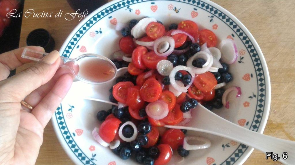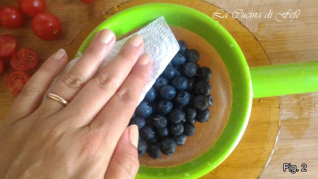 Rinse the blueberries under running water with the help of a colander, then gently pat them dry with kitchen paper (fig. 2). On a cutting board, cut the cherry tomatoes perfectly in half if they are small or quarter them if they are larger (fig. 3).