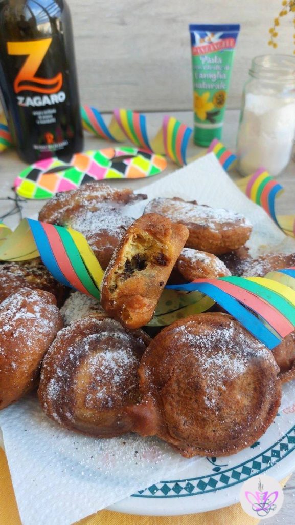 This year for Carnival, I planned to share several new themed recipes here on the blog, both sweet and savory, to cheer up these festive days, but unfortunately, my health has been quite shaky and kept me out of the kitchen! I only managed to prepare these quick fritters with chocolate chips that you will notice are a bit darker due to the whole cane sugar used instead of the classic granulated sugar, which colored the dough. Sure, aesthetically, they aren’t photogenic, but the taste is really delicious and indulgent, and the aroma is exquisitely citrusy, you can trust me! Moreover, they are without yeast because I simply used baking powder for sweet preparations that sped up the execution, so they will be perfect for those occasions when you have unexpected guests, or if you have kids, for their carnival snack! You will only need a bowl and a ladle! Once ready, the fritters will be dipped in boiling oil, which will make them crispy and golden. To give them an extra touch of sweetness, the fritters are sprinkled with powdered sugar to taste! The final result? Fritters as soft as clouds, fragrant and tasty, that will win the heart of anyone who tastes them.