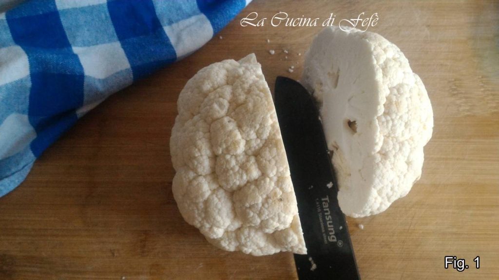 After cleaning the cauliflower, removing part of the stalk and outer leaves which you can use for other recipes, wash it thoroughly under running water and cut it in half (fig. 1).