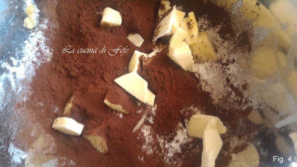 • Proceed to prepare the cocoa dough: in another bowl, sift the cocoa and mix it with the flour. Then add the cold butter in cubes.