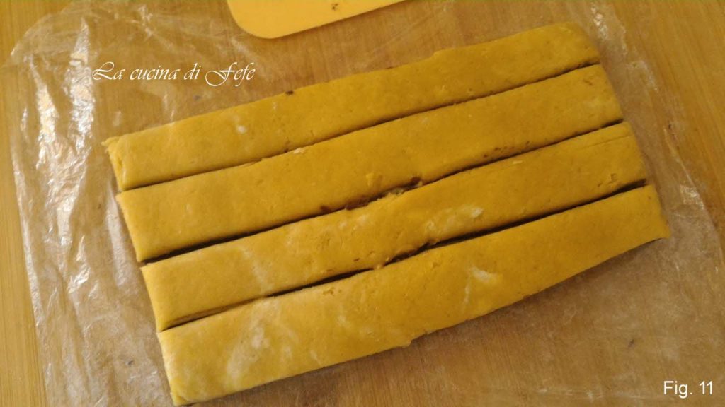 • Place in the fridge for 15′ covered with cling film, then cut the dough into 4 strips from the longer side.