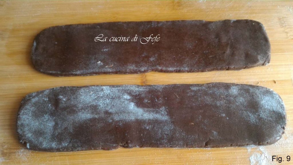 • Roll out with a rolling pin to obtain two rectangles of the same size, approximately 2 1/2 inches wide and 12 inches long and with a thickness of just under 3/8 inch.