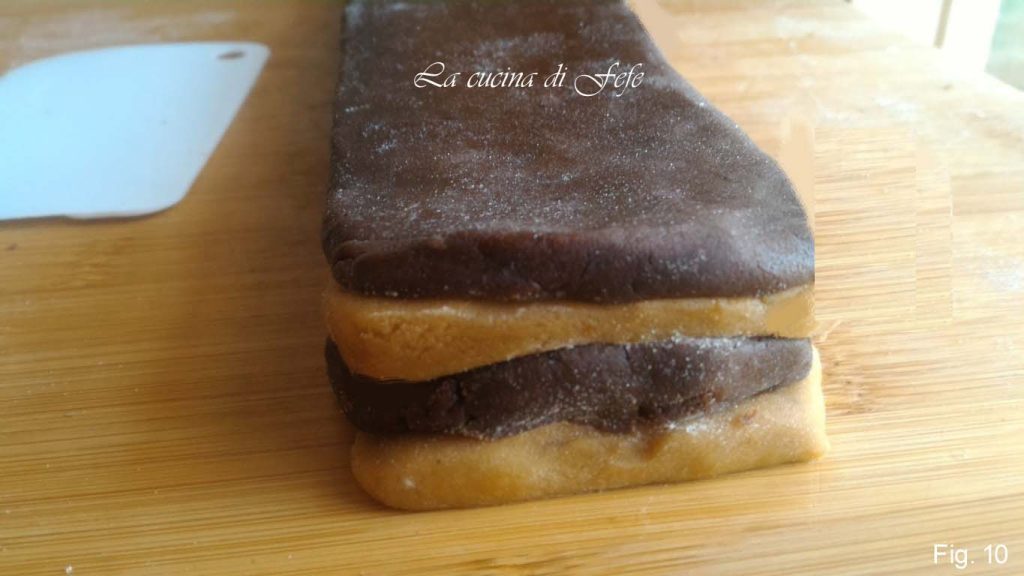 • Compact it so that all the strips are well attached, brushing them with a little milk if necessary. Place in the fridge for 30′ (or 15 minutes in the freezer) to get clean cuts that do not smear the colors, then cut the cookies into checkerboards with a thickness of about 1/4 inch.