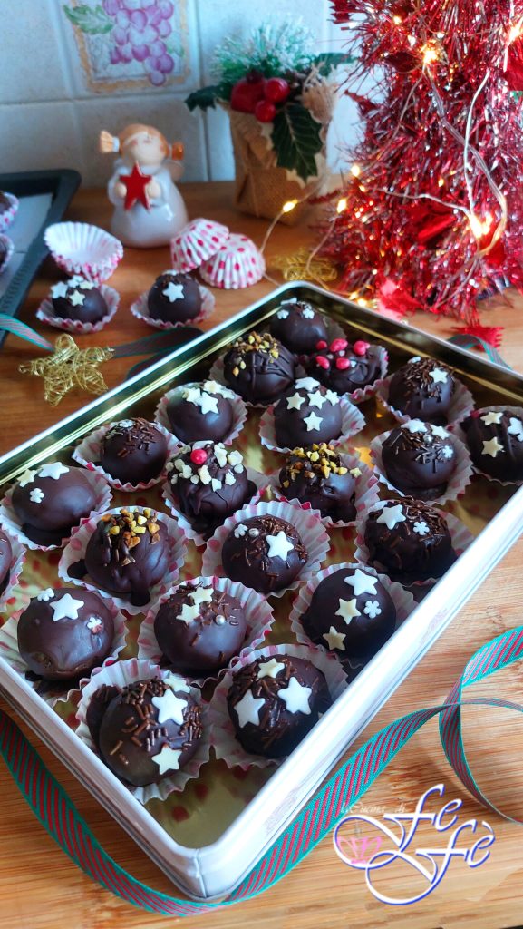 Place them one by one on a baking tray lined with parchment paper and, before the chocolate solidifies, decorate them as you like. I used sugar and white chocolate stars, and chocolate sprinkles.
