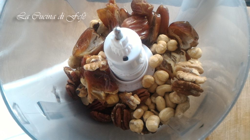 In the bowl of a food processor or blender, combine the mix of nuts and the pitted dates.