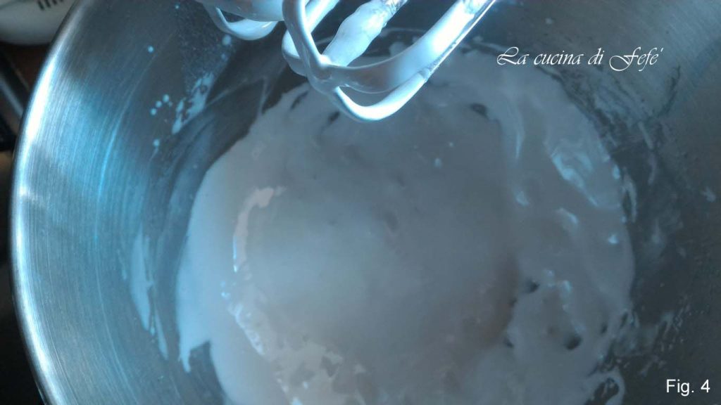 Then gradually incorporate the sifted powdered sugar and continue to whisk for another 3′ approximately (fig. 3).