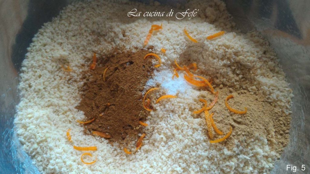 Separately, combine the almond flour, cinnamon, ginger, grated orange zest, and a pinch of salt and mix well (fig. 5).