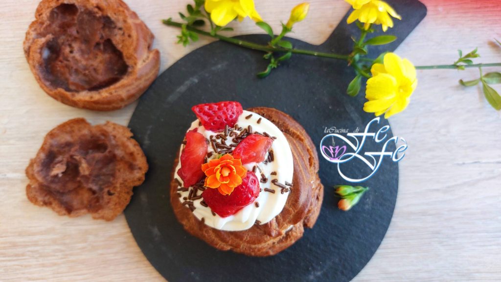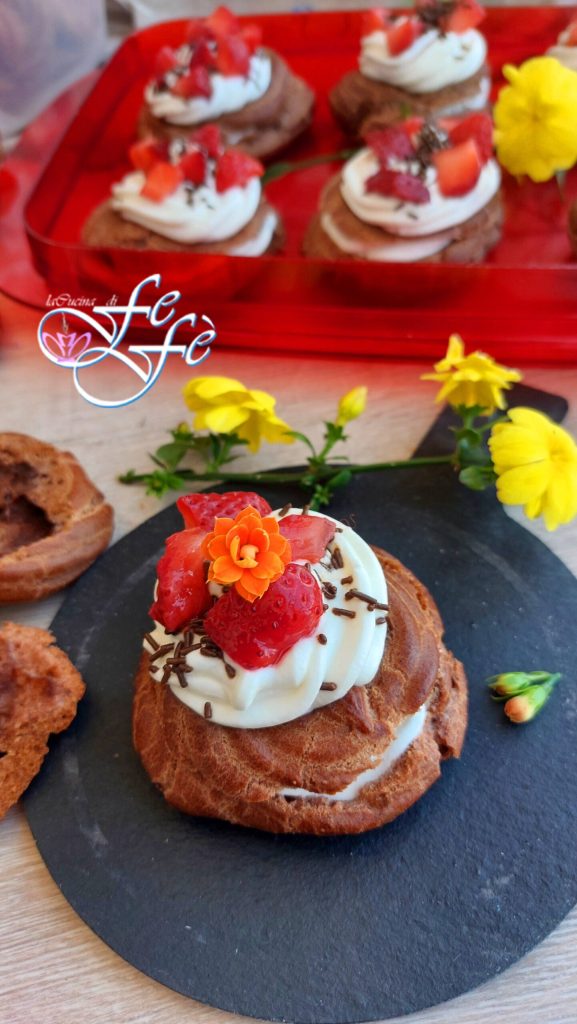 You are ready to assemble your cocoa choux pastry zeppole. Once cooled, cut off the top with a knife and fill them with the mascarpone and yogurt frosting. Close them and garnish also on top. Add chocolate shavings or sprinkles and some strawberry pieces.