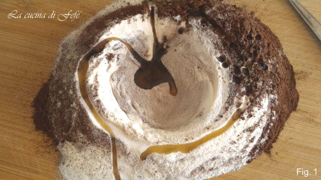 On a work surface, pour the sifted semolina with cocoa. Add a pinch of salt and form a well, then add the oil in a trickle at the edges.