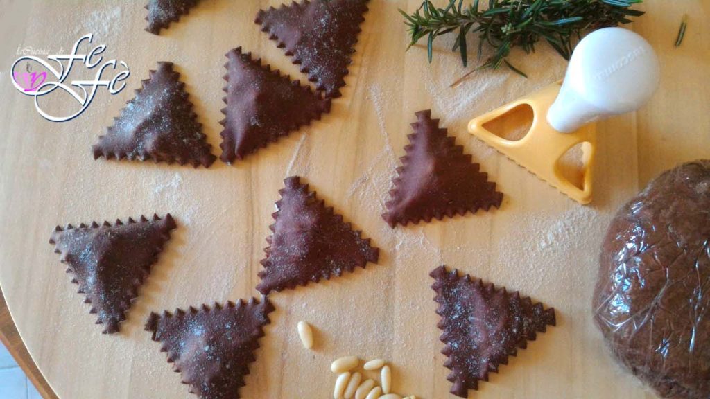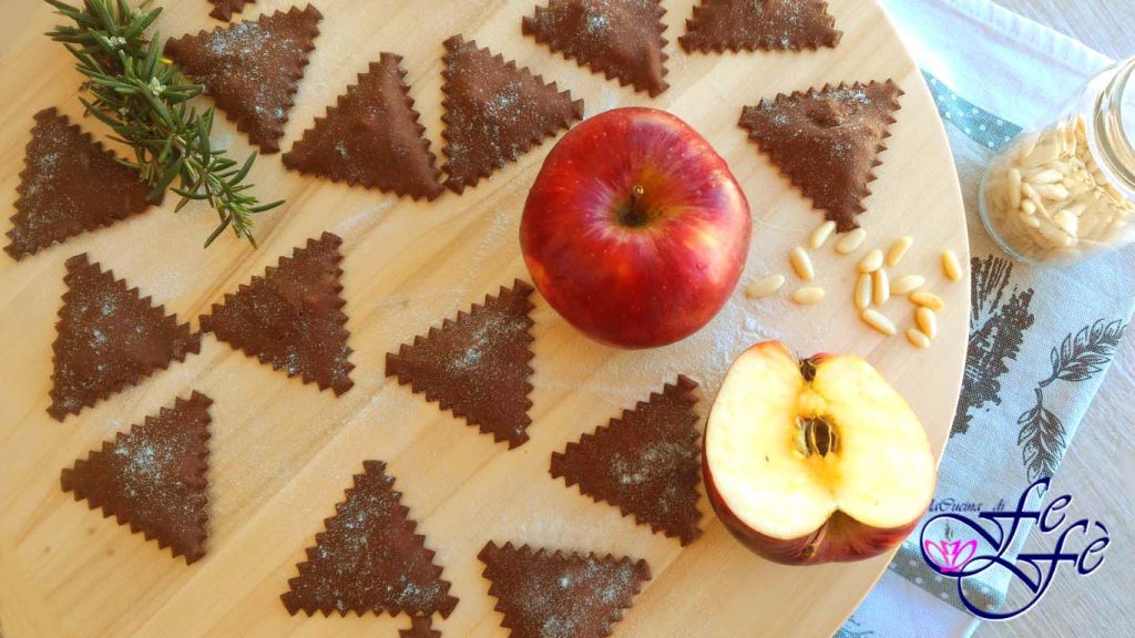 There’s no denying it, making homemade pasta has become a real passion. I’m enjoying it more and more and love all the variations this type of preparation can offer the palate. Today, therefore, I am happy to share with you the recipe for truly unique and out-of-the-ordinary ravioli, made with remilled semolina and cocoa. The filling will surprise you even more because it’s essentially based on Red delicious apples, with a crunchy, aromatic, and sweet pulp, in contrast with the decidedly strong and pleasantly spicy taste of aged pecorino cheese. A combination that will amaze your guests with its peculiarity. It will be the ideal recipe for holidays, family Sundays, and special occasions. Moreover, the dough is egg-free, ensuring unimaginable lightness! To see the complete dish, be patient. I hope to publish it on the blog soon; in the meantime, save the recipe with all the step-by-step photos and I hope you love it as much as I did!
