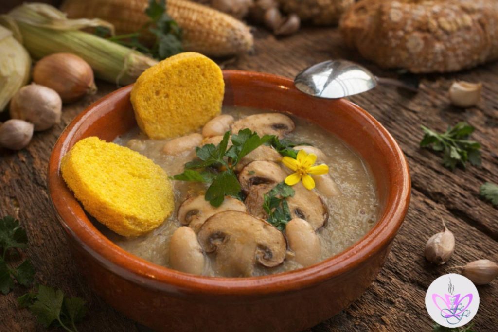 • Also add the beans previously rinsed under running water, and let it simmer for another 5 minutes, then adjust for salt. Turn off the heat and blend with an immersion blender. Serve the soup hot with the remaining whole mushrooms, freshly chopped parsley, and turmeric croutons.