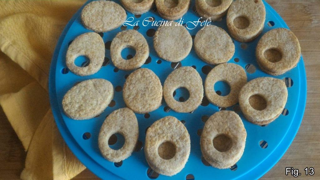In half of the shapes, make a central hole using the base of a pastry nozzle (fig. 11). Arrange the shapes on a baking sheet lined with parchment (fig. 12).