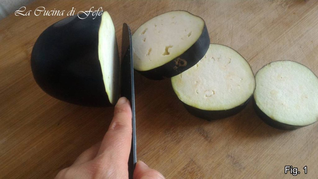 • Start by washing and trimming the eggplant, then cut it into slices about 3/4-inch thick on a cutting board (fig. 1).
