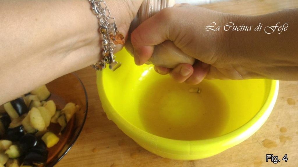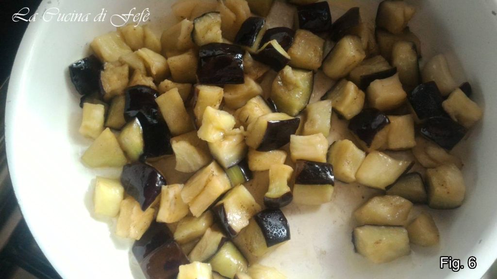 • In a non-stick pan, brown the garlic clove with two tablespoons of oil and two tablespoons of hot water, then add the cubed eggplant and the rest of the hot water (fig. 6). Cook covered for about 12-14′ or until they appear soft enough, then turn off the heat, adjust with salt and pepper (fig. 7).