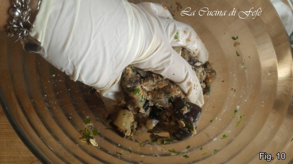 • Once cooled, transfer the cubed eggplant to a bowl along with the breadcrumbs, Grana Padano, and rolled oats (fig. 8). Finish with a generous sprinkle of finely chopped parsley and mint (fig. 9).