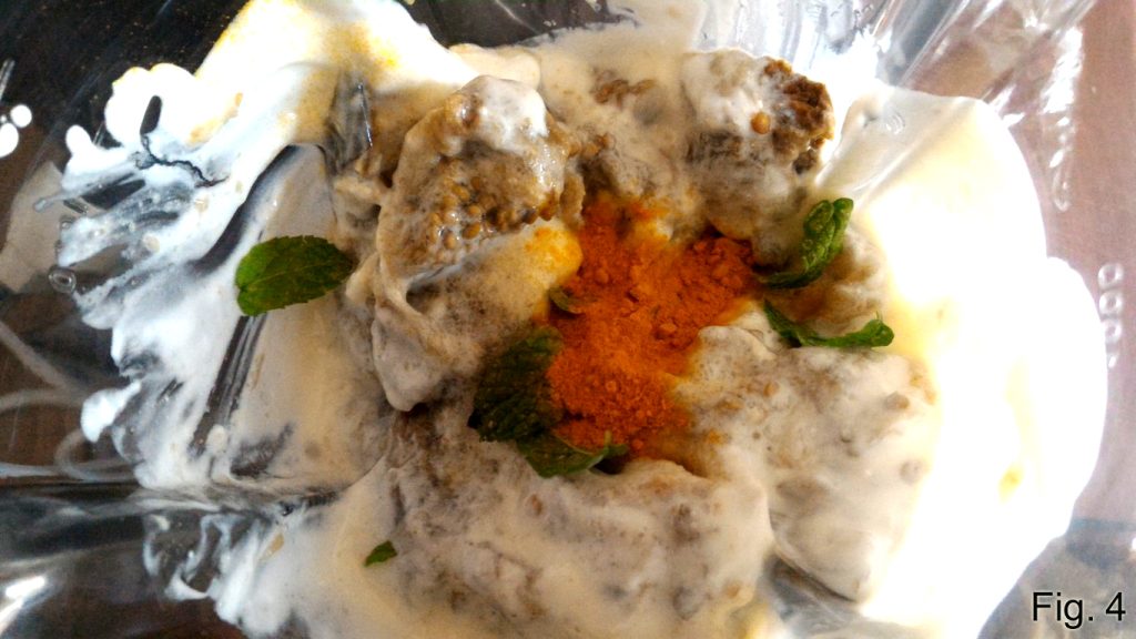 Squeeze the eggplants to remove excess water and blend them in a mixer with yogurt, squeezed lemon, turmeric, mint leaves to taste and a drizzle of oil. Complete with a pinch of salt (fig. 2).
